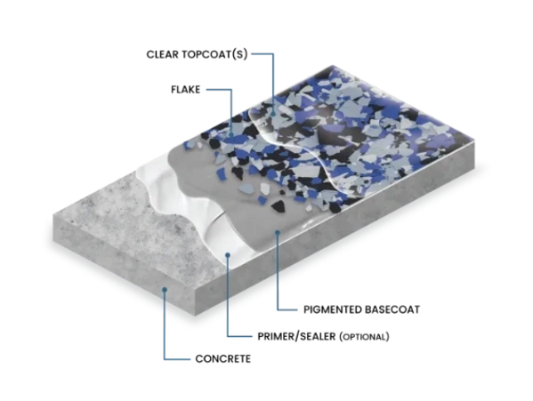 The flake floor system involves meticulous steps for a stunning finish. Firstly, the concrete surface undergoes preparation, ensuring a clean canvas for adhesion. Application begins with the resin base coat being meticulously applied, followed by the delicate scattering of decorative flakes onto the wet base. To encapsulate and safeguard the design, a clear topcoat is skillfully applied. Finally, the floor is left to cure and dry, allowing the system to settle and solidify before it's ready for use.